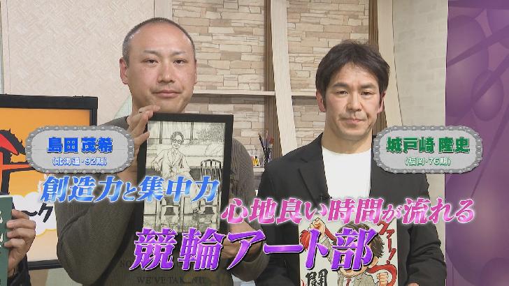今回のテーマは心を豊かにするアート。繊細で緻密なイラストを得意とする島田茂希選手と人々を幸せな気分にさせてくれる似顔絵師、城戸崎隆史選手が競輪アート部として登場!